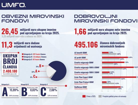 Na kraju 2025. godine obvezni mirovinski fondovi upravljali su imovinom ukupne vrijednosti 26,5 milijardi eura, što u odnosu na prethodnu godinu predstavlja povećanje od 3,2 milijarde eura ili 13,9 %.
