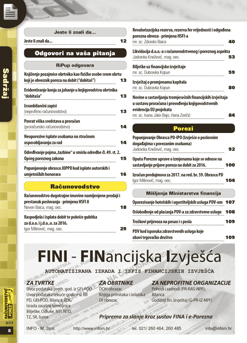 Mjesečnik Računovodstvo i porezi u praksi izlazi petnaest godina i vjerujemo da smo opravdali povjerenje pretplatnika što i dokazuje velik broj čitatelja ovog praktičnog mjesečnika za računovođe, knjigovođe, revizore, porezne savjetnike i financijske djelatnike. Stoga vas pozivamo da se pretplatite na časopis čime dobivate pravo na besplatan pristup call centru, gdje tim eksperata svakodnevno odgovara na vaša pitanja iz područja računovodstva, poreza, plaća i naknada, radnih odnosa, trgovačkog prava.
