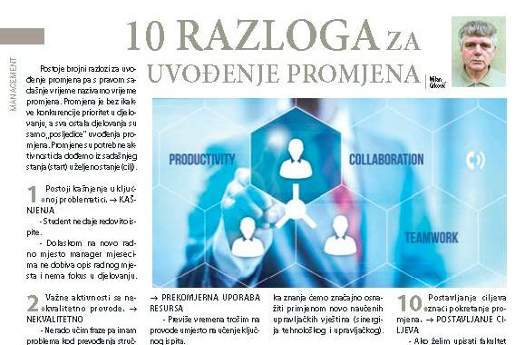 Postoje brojni razlozi za uvođenje promjena pa s pravom sadašnje vrijeme nazivamo vrijeme promjena. Promjena je bez ikakve konkurencije prioritet u djelovanju, a sva ostala djelovanja su samo „posljedice“ uvođenja promjena.