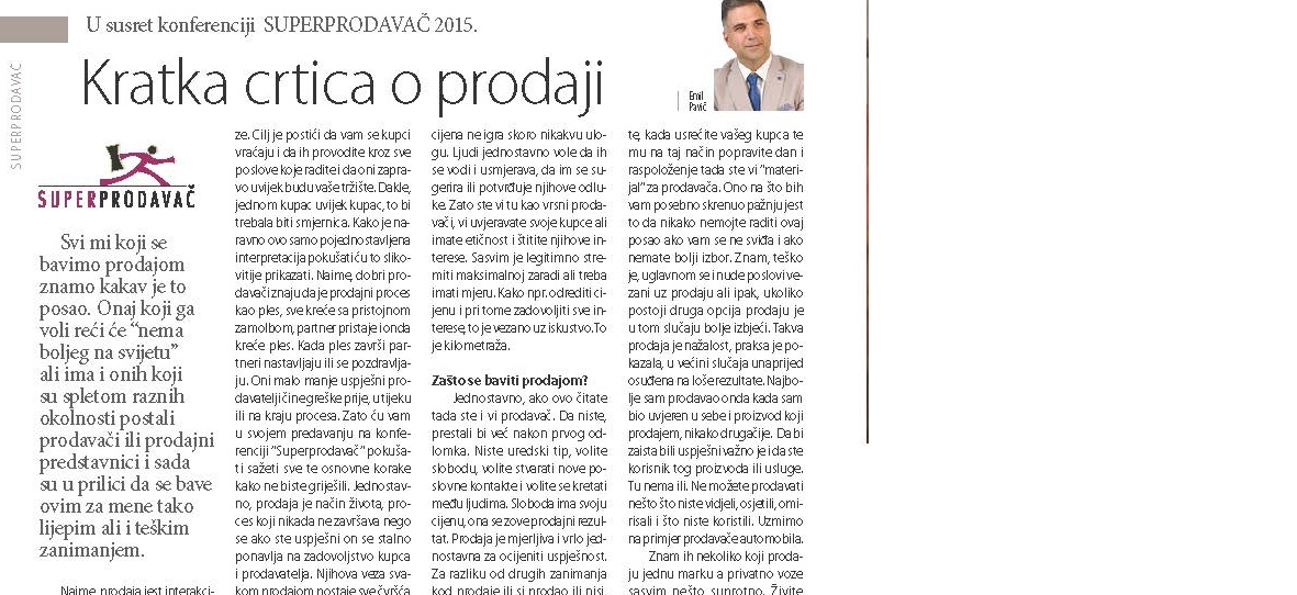 Svi mi koji se bavimo prodajom znamo kakav je to posao. Onaj koji ga voli reći će “nema boljeg na svijetu”, ali ima i onih koji su spletom raznih okolnosti postali prodavači ili prodajni predstavnici i sada su u prilici da se bave ovim za mene tako lijepim ali i teškim zanimanjem.