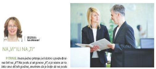 Ipak, to je stvar svačijeg osobnog izbora i stila i samo po sebi nije presudno. Jedino što je bitno u tome je uzajamnost. Nemojte biti s ljudima napola na „ti“, na način da su oni s vama na „vi“, a vi s njima na „ti“. To je ono što je neprofesionalno i nekulturno. Isto je i s tituliranjem: čak i ako ste svi na „vi“, obraćanje s „direktore“ i „Ankice“ nikako nije ravnopravno.