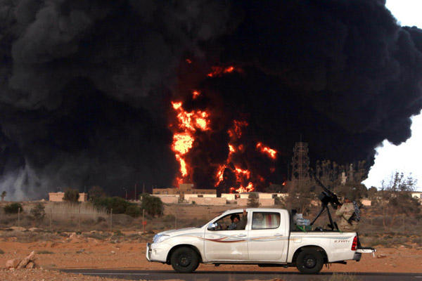 Zbog straha od nestašice goriva pred benzinskim su crpkama formirani dugački redovi. Pobunjenici su objavili da Gadafijeve snage bombardiraju samo puna spremišta goriva i da im je netko dojavio točne koordinate.