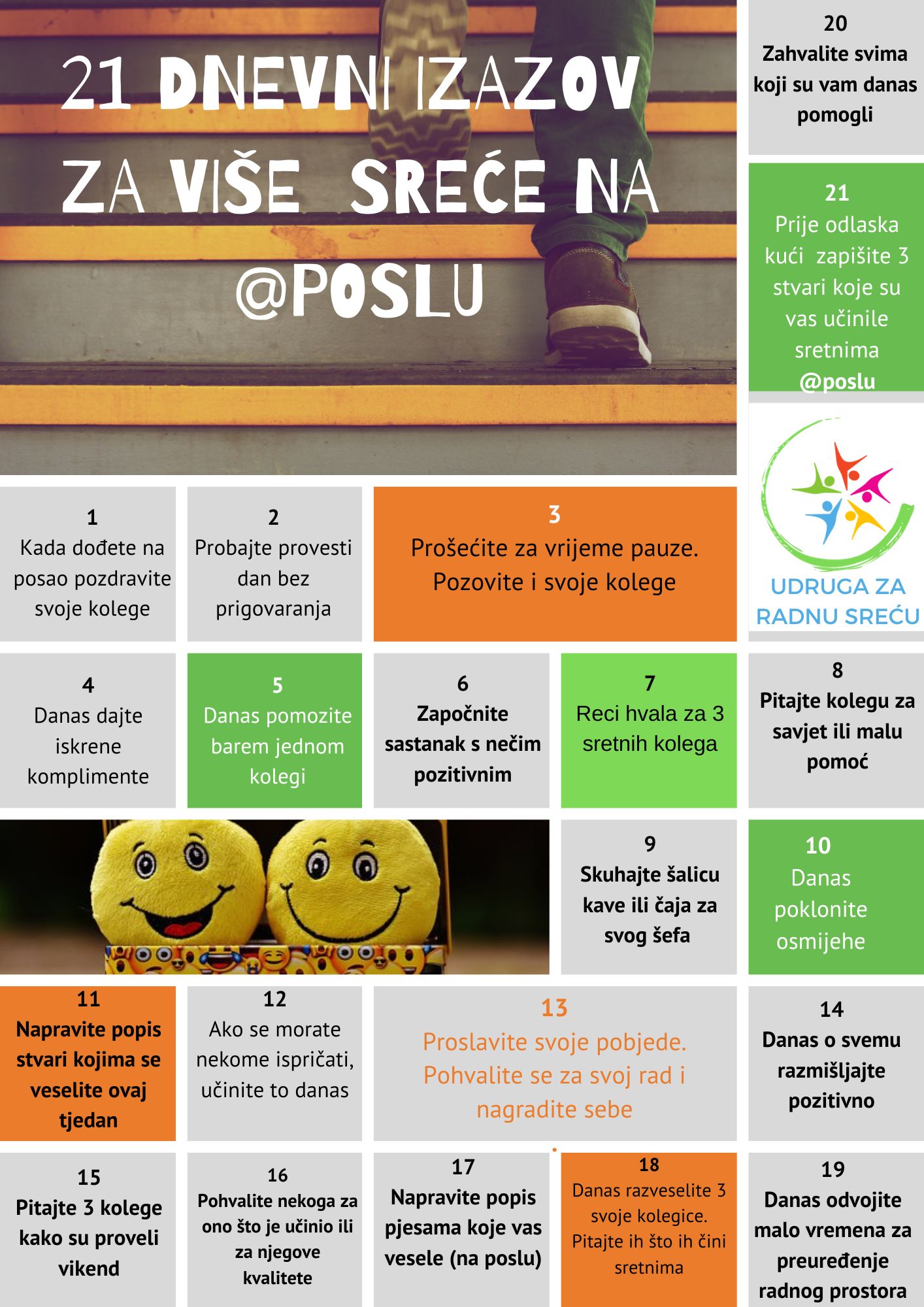 Uz edukaciju, Udruga je pripremila 21-dnevni izazov za više radne sreće koji dostavljamo u prilogu. 21-dnevni izazov za više radne sreće može biti iznimno koristan alat za podizanje svijesti i promicanje pozitivnih promjena u životima