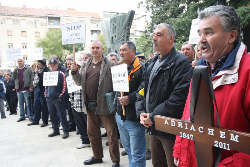 Prosvjednici su nosili križ na kojem je pisalo "Adriachem 1947.-2011.", te transparente s natpisima "Stop lažnim obećanjima", "Radnici, ratnici, patnici" i "Nećemo stečaj".