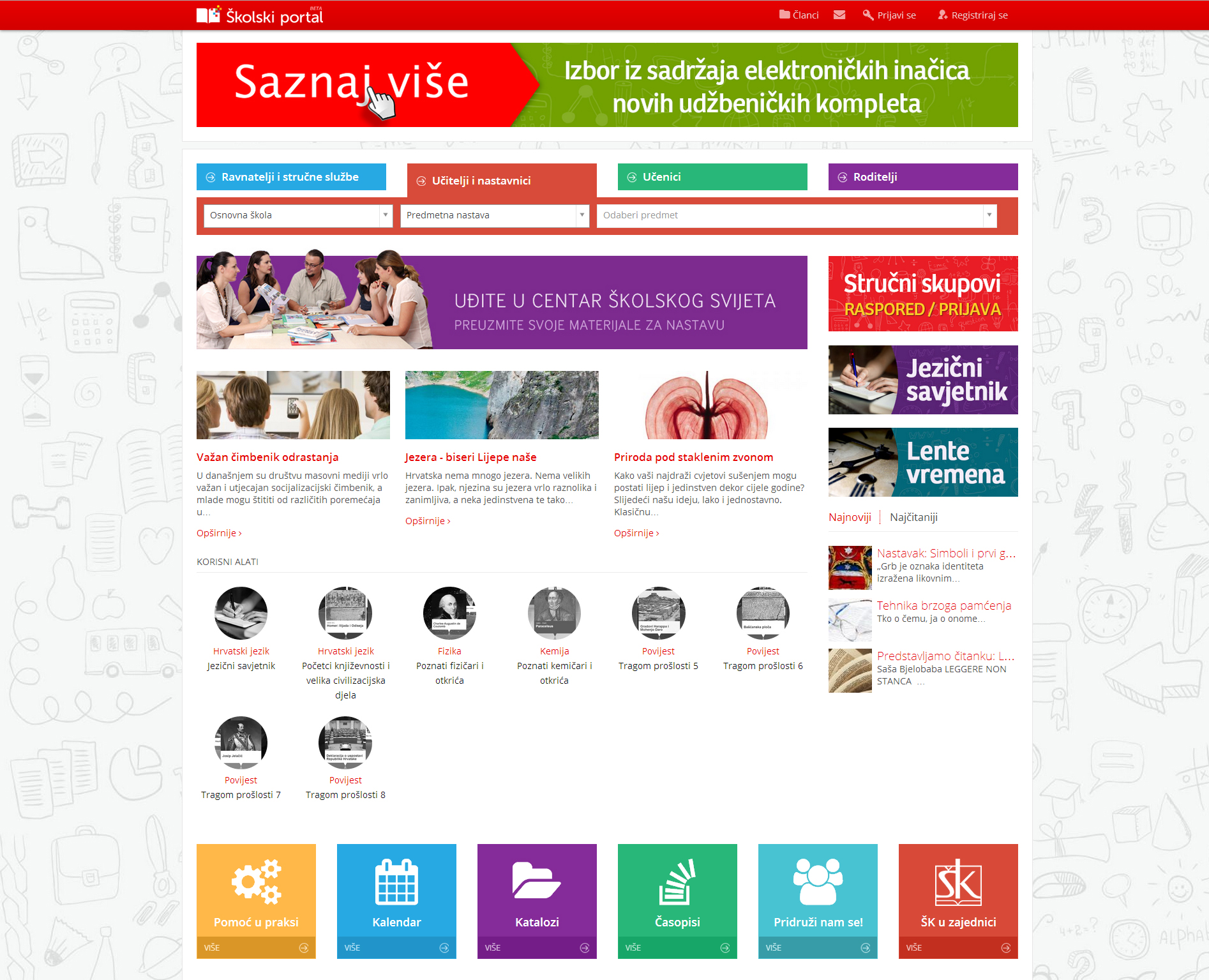 Školska knjiga predstavila je novi multimedijalni Školski portal, inovativno multimedijalno rješenje za podršku u nastavi. Ovaj u potpunosti hrvatski proizvod, nudi jednostavan i brz pristup suvremenom edukativnom materijalu koji potpisuju ugledni hrvatski autori, a koji će osigurati nastavnicima prijeko potrebnu podršku u pripremi nastavnog sadržaja prilagođenog novoj digitalnoj generaciji učenika.