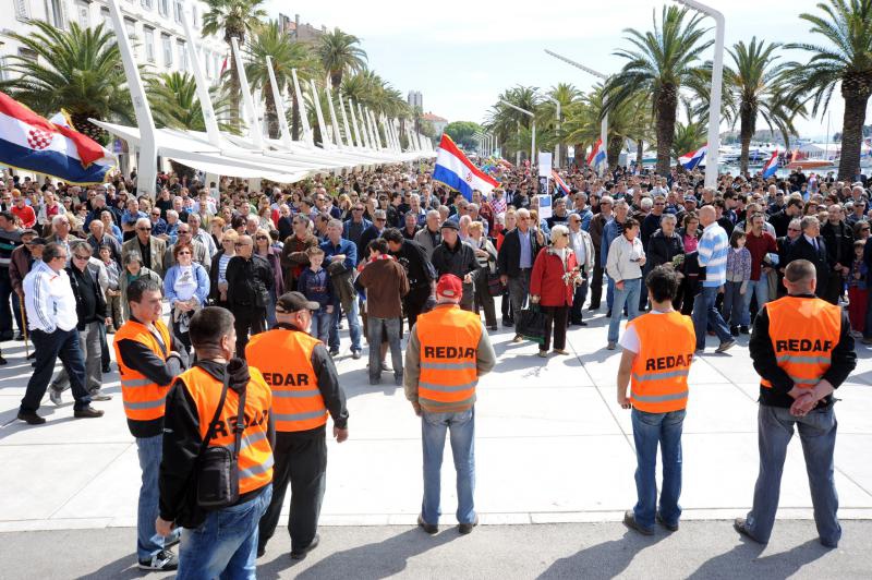 U blizini bine na Rivi bio je istaknut višemetarski tarnsparent s natpisom „Stop progonu branitelja“, prosvjednici su nosili hrvatske zastave, neki portrete generala Ante Gotovine. Za vrijeme prosvjeda preko razglasa su puštane domoljubne pjesme, a državna zastava na Marjanu bila je spuštena na pola koplja.