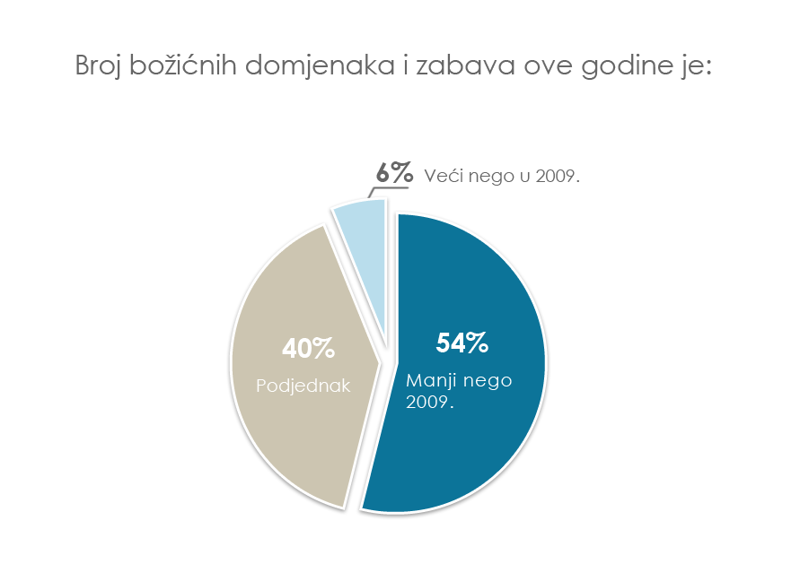 Prema prikupljenim podacima, većina hotela (njih 54%) ove godine bilježi manji broj božićnih domjenaka nego prošle, dok je kod 40% hotela broj domjenaka ostao na prošlogodišnjoj razini. Tek 6% hotela iskazalo je porast u odnosu na prošlu godinu. Negativan trend vlada i po pitanju potrošnje, pa tako čak 60% hotela bilježi pad potrošnje, 33% ih je ostalo na razini 2009-e, a svega 7% je zabilježilo rast potrošnje na blagdanskim događanjima.