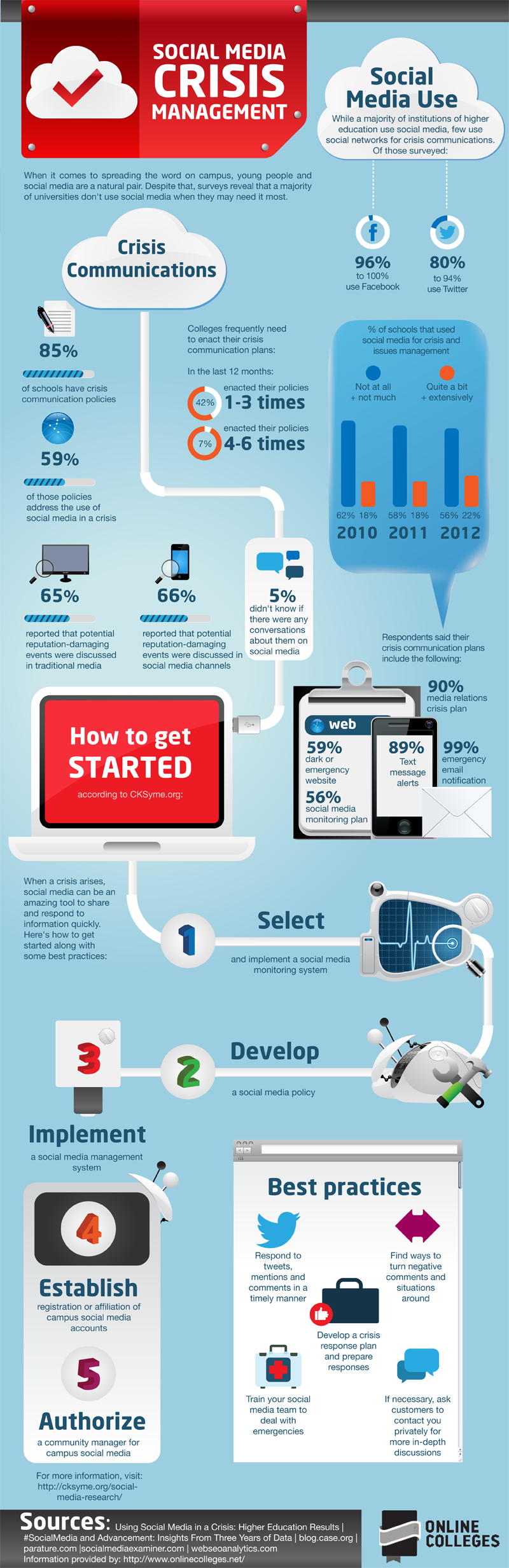 Zahvaljujući novim tehnologijama loše vijesti se danas šire bre nego ikada prije te je zanimljivo promotriti koju ulogu u kriznom komunciranju imaju društvene mreže. Onlinecollleges.net napravili su zanimljivu infografiku koja pokazuje kako sveučilišta i škole (ne)koriste drušvene mreže za potrebe kriznog komuniciranja.