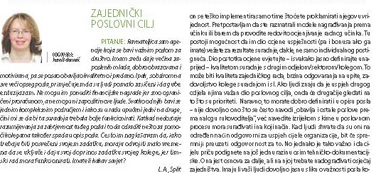To može biti kvaliteta zajedničkog rada, brzina odgovaranja na upite, zadovoljstvo kolege suradnjom i sl. Ako ljudi znaju da je uspjeh drugog odjela njima važan dio poslovnog cilja, onda će drugačije gledati na to što su prioriteti. Naravno, to morate dobro definirati i u opisu posla – nije dovoljno ono što se često navodi „obavlja i ostale poslove prema nalogu rukovoditelja“, već navedite izrijekom s kime u poslovnom procesu mora surađivati i na koji način.