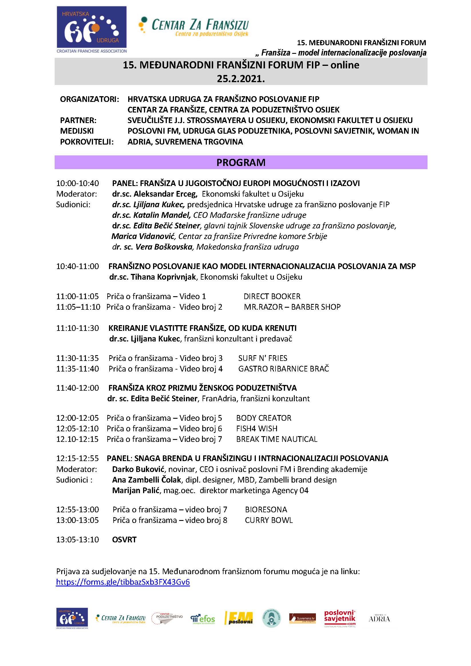 Sve ovo su razlozi zašto bi bilo dobro da poslušate 15. Međunarodni franšizni forum FIP koji će se održati 25.2.21. od 10 sati. Sudjelovanje je besplatno, program je u nastavku, a prijaviti se možete preko linka https://forms.gle/zgqfVHGbvHRjGQZE7