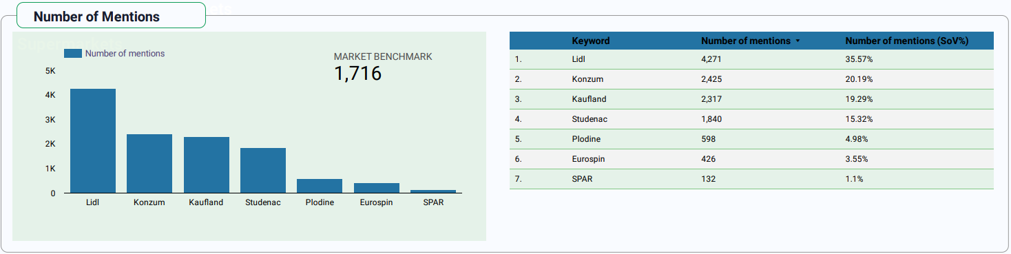 Lidlov veliki doseg ne iznenađuje s obzirom da je riječ o velikom, poznatom lancu koji posluje u 31 zemlji. U Hrvatskoj, Lidl je prisutan već godinama s brojnim supermarketima diljem zemlje. Kupci su ga spomenuli 4.271 puta, znatno iznad prosjeka od 1.716. Kupci su upoznati s brendom, a njegova jaka prisutnost potiče velik broj rasprava.