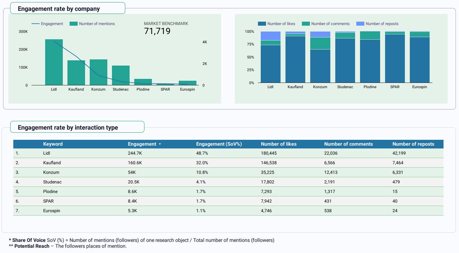 Konzum i Kaufland prate Lidl po broju spominjanja i dosegu publike. No, postoji zanimljiv obrat: iako su kupci spominjali Konzum nešto više od Kauflanda – 2.475, u usporedbi s Kaflandovih 2.317 – Kaufland znatno nadmašuje Konzum po pitanju angažmana publike. Dok Kaufland broji više od 166 tisuća interakcija s publikom, Konzum ih ima samo 54 tisuće.