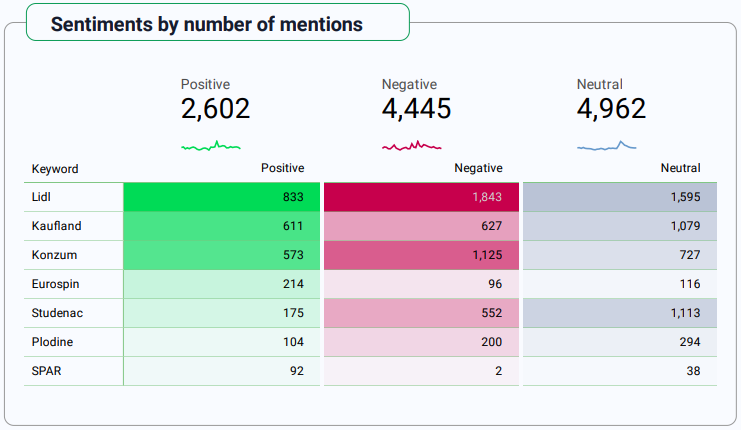 Lidl se ponovno izdvaja po pozitivnim spominjanjima, njih 833. Istodobno, SPAR ima najviši udio pozitivnih spominjanja (gotovo 70%). Eurospin se također dobro drži s udjelom pozitivnih spominjanja od 50%, što je značajno iznad prosjeka od 31%.