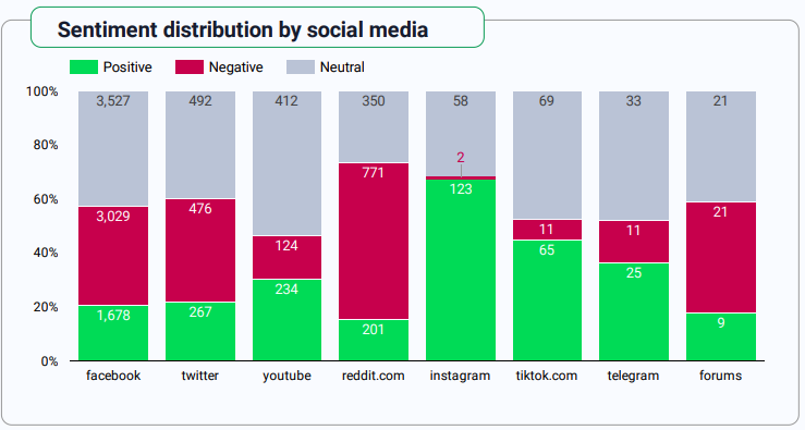 Reddit se pokazao kao središte negativnih komentara, gdje oni čine 58,3% razgovora. Korisnici Instagrama skloniji su pozitivnim komentarima te je 67,2% spominjanja na toj platformi pozitivnog sentimenta.