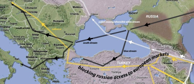 Južni tok počet će u Novorusijsku na ruskoj crnomorskoj obali i do bugarske Varne u duljini od 900 kilometara gradit će se pod morem. Iz Varne će ići u dva smjera, prvi preko Grčke do južne Italije, a drugi preko Srbije, Mađarske, Hrvatske i Slovenije do Austrije i sjeverne Italije.
