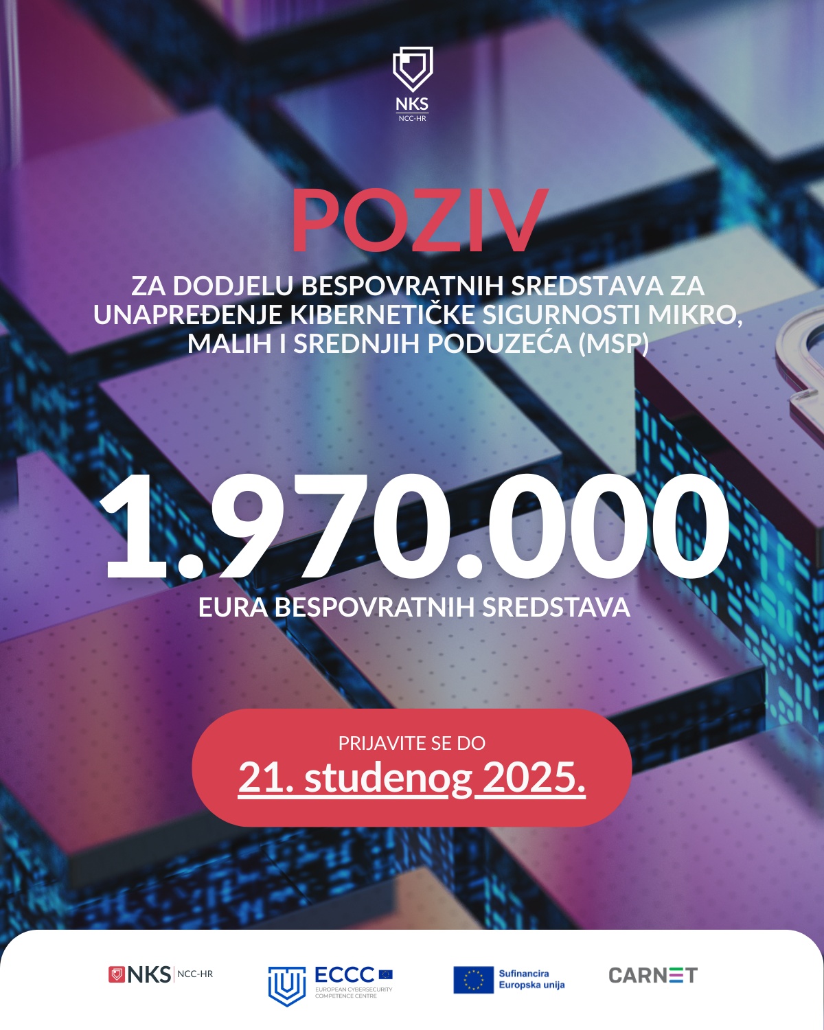 Hrvatska akademska i istraživačka mreža – CARNET, kao Nacionalno koordinacijsko središte za industriju, tehnologiju i istraživanja u području kibernetičke sigurnosti (NKS/NCC-HR), objavila je Poziv na dostavu projektnih prijedloga u okviru projekta Deploying Croatian National Coordination Center (NCC-HR), financiranog iz Programa Digitalna Europa, u vrijednosti od 1,97 milijuna eura bespovratnih sredstava.
