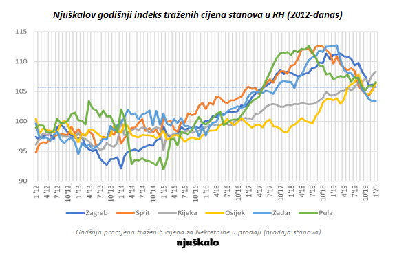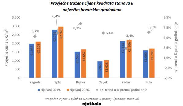 Prema novom istraživanju Njuškala, provedenom na uzorku od 164 tisuće aktivnih oglasa u siječnju 2020. godine, cijene nekretnina u Hrvatskoj pokazuju porast od gotovo 7 posto na godišnjoj razini, dok je prema siječnju 2017. godine zabilježen rast cijena veći od 15 posto.