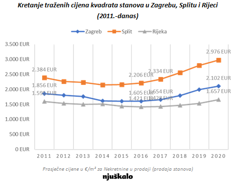 Gledamo li podatke o traženim cijenama stanova od 2011. do danas u tri najveća hrvatska grada; Zagrebu, Splitu i Rijeci, vidljivo je kako je Split bilježio najveći rast, dok istovremeno Rijeka bilježi najmanji rast, oko 4 posto i to ponajviše zahvaljući rastu u posljednih godinu dana za oko 8 posto.