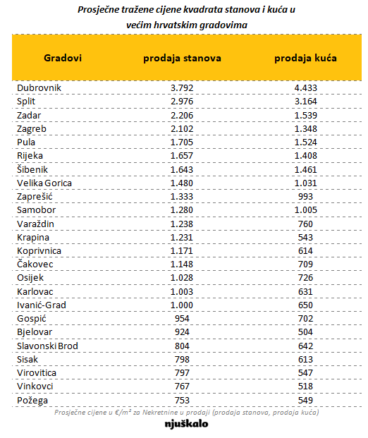 TRAŽENE CIJENE NEKRETNINA U HRVATSKIM GRADOVIMA