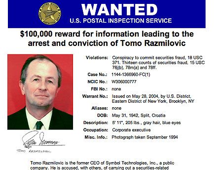 Porijeklom iz Splita, Tomu Razmilovića vlasti u Sjedinjenim Američkim Dražavama smatraju krivim za 200 milijuna dolara tešku burzovnu prevaru koja je 2004. silovito potresla Wall Street. Njegovo lice nalazi se na FBI-evoj tjeralici, a onoga tko ga namami u zamku američke vlasti će nagraditi sa 100.000 dolara. Tvrtka Symbol Technologies pune tri godine činila je planske malverzacije i lažno prikazivala dobit. Na taj način su pumpali vrijednosti dionica.
