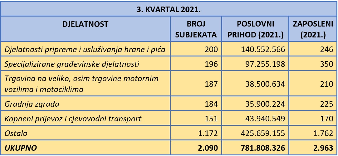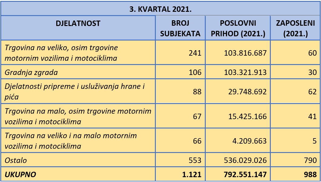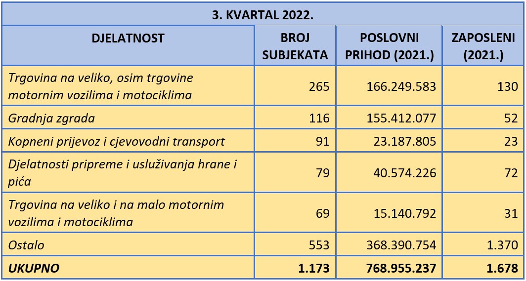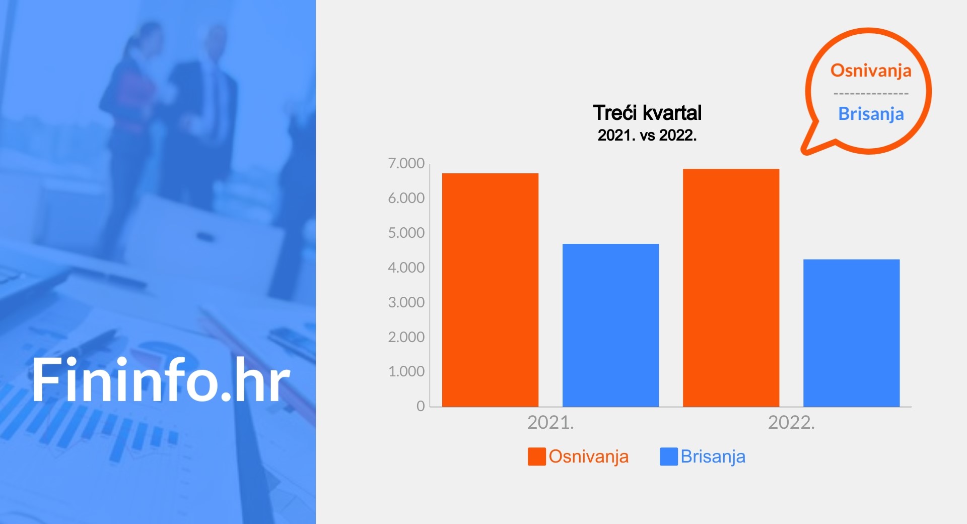 Osnovano je 6.866 novih subjekata (2% više nego u istom razdoblju prošle godine), a brisano je 4.259 (9% manje nego u istom razdoblju prošle godine) što daje razliku između osnovanih i brisanih subjekata od 2.607 (28% više nego u istom razdoblju prošle godine).