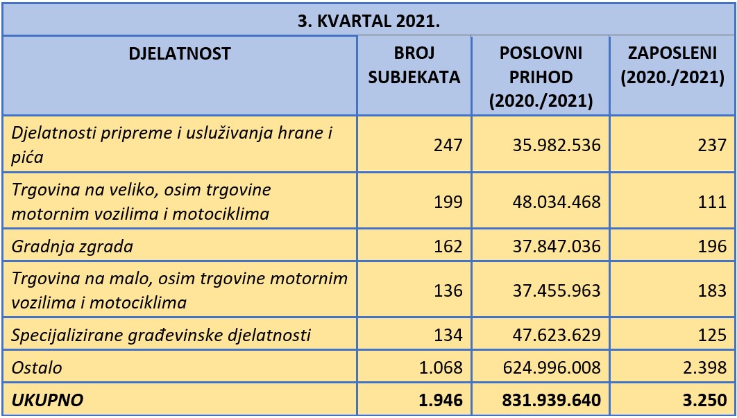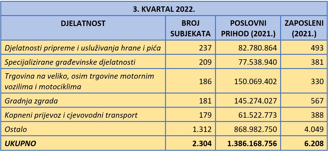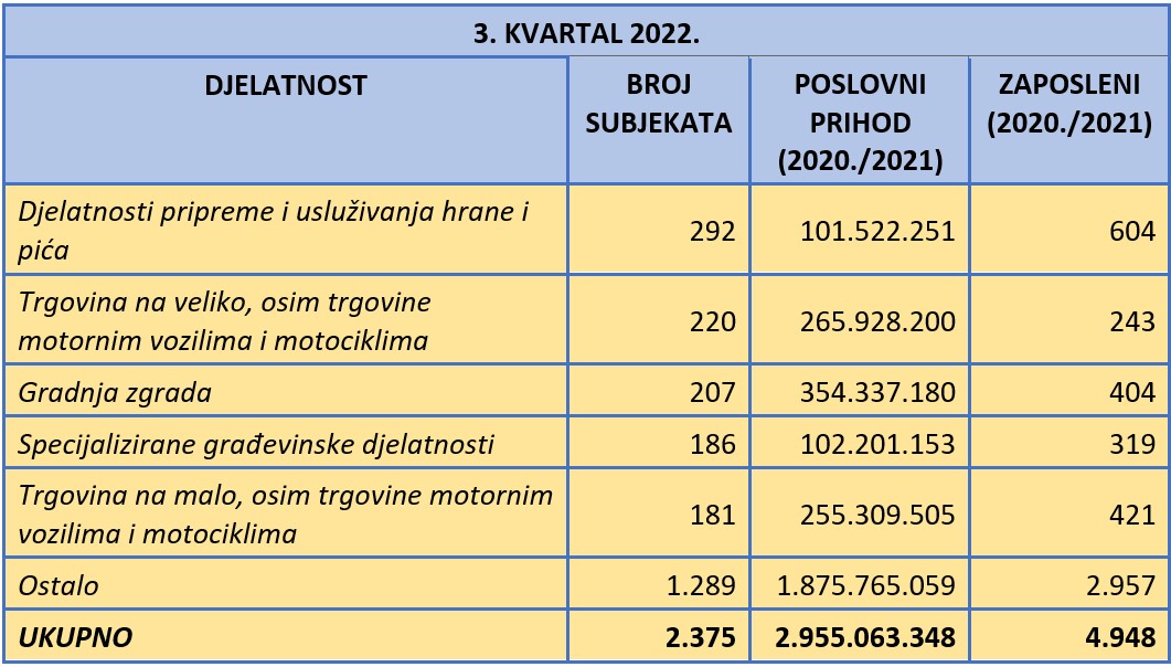 U prosjeku 35% gore navedenih subjekata je predalo godišnje financijske izvještaje za 2021. godinu. Krajem trećeg kvartala 2022. godine bila su 1.173 subjekta s evidentiranim poreznim dugom (5% više nego u istom razdoblju prošle godine), a oni koji su predali GFI ostvarili su 769 mil. kn poslovnih prihoda (3% manje nego takvi subjekti u istom razdoblju prošle godine) te su zapošljavali 1.678 radnika (70% više nego takvi subjekti u istom razdoblju prošle godine). U prosjeku je krajem oba razdoblja 52% subjekata s evidentiranim poreznim dugom poslovalo u navedenih TOP 5 djelatnosti.