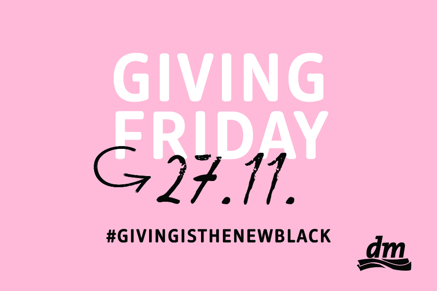 U petak, 27. studenog, umjesto Crnog petka dm će i ove godine tradicionalno obilježiti treći u nizu Giving Friday u sklopu kojeg će donirati higijenske i ostale potrepštine u vrijednosti od čak pet posto dnevnog prometa ostvarenog u svim prodavaonicama i dm online shopu. dm poziva sve kupce da kupnju pretvore u dobro djelo i pomognu uvećati iznos donacije koja je namijenjena Socijalnim samoposlugama Hrvatskog Crvenog križa.