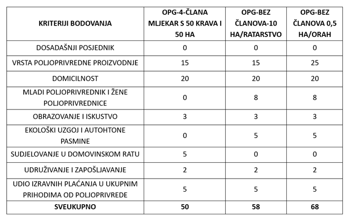 Gornja tablica prikazuje praktične primjere rezultata natječaja prema aktualnom Zakonu o poljoprivrednom zemljištu. Na natječaju se ne boduju niti dovoljno vrednuju, uspješna proizvodnja, prošla niti buduća financijska ulaganja u proizvodnju, broj članova OPG-a, broj zaposlenih u tvrtkama, kvaliteta proizvoda, tehničke inovacije kao ni ulaganje u navodnjavanje. Na natječajima zemljište se daje na rok od 15-25 godina te ovakvi kriteriji bodovanja, koji najuspješnijima uskraćuju resurse u proizvodnji, potencijalno mogu nanositi štetu poljoprivrednoj proizvodnji još desetljećima.