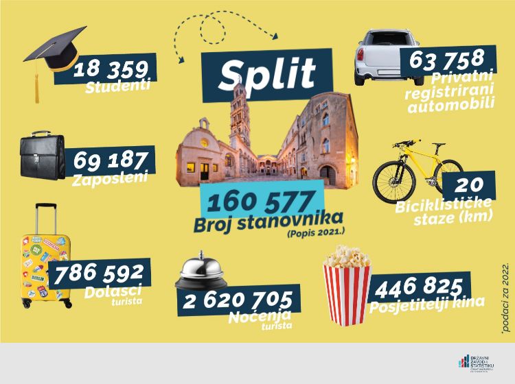Blagdan Svetog Duje, 7. svibnja, datum je velike proslave u Splitu. Dobar je to uvod i u turističku sezonu. Naime, već i galebovi na rivi znaju da drugi grad po broju stanovnika u Hrvatskoj silno privlači turiste, koji su u 2022. upravo u tom gradu ostvarili više od 2,6 milijuna noćenja. Iako su turistički rezultati vjerojatno brojevi koji se u Splitu najviše iščekuju, pregledajte i ostale izdvojene podatke.
