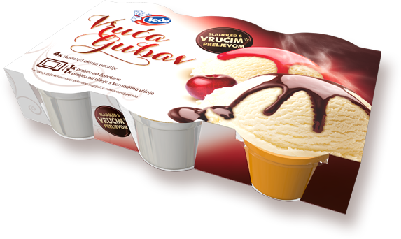 Sladoled Vruća ljubav sadrži četiri čašice sladoleda od vanilije te dvije čašice s preljevom od čokolade i višnje. Sladoled je inovativan upravo zbog kombinacije hladnog okusa vanilije i vrućeg okusa preljeva čokolade ili višnje, koje je potrebno prethodno zagrijati u mikrovalnoj pećnici.