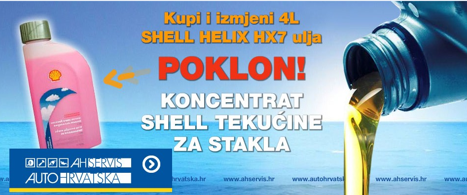 Ljetna Shell Helix HX7 10W-40 akcijska ponuda! Uz kupnju i izmjenu četiri litre motornog ulja Shell Helix HX7 10W-40 u svim AH Servisima, AH Servis poklanja svakom korisniku Shell Summer Screenwash – visokokoncentrirano sredstvo za pranje vjetrobranskih stakala koje uz miješanje s vodom daje do 50 litara tekućine za stakla vrhunske kvalitete!Shell Summer Screenwash kojeg korisnici dobiju na poklon u AH Servisima  prilikom kupnje i izmjene motornog ulja Shell Helix HX7 10W-40, je visokokoncentrirano ljetno sredstvo za pranje vjetrobranskih stakla koje uklanja sve nećistoće anorganskog i organskog podrijetla, štiti metlice brisača, ne oštećuje kromirane površine i boju. Ugodan miris i učinkovito čišćenje površina osiguravaju udobnost vožnje i poboljšanu vidljivost!
