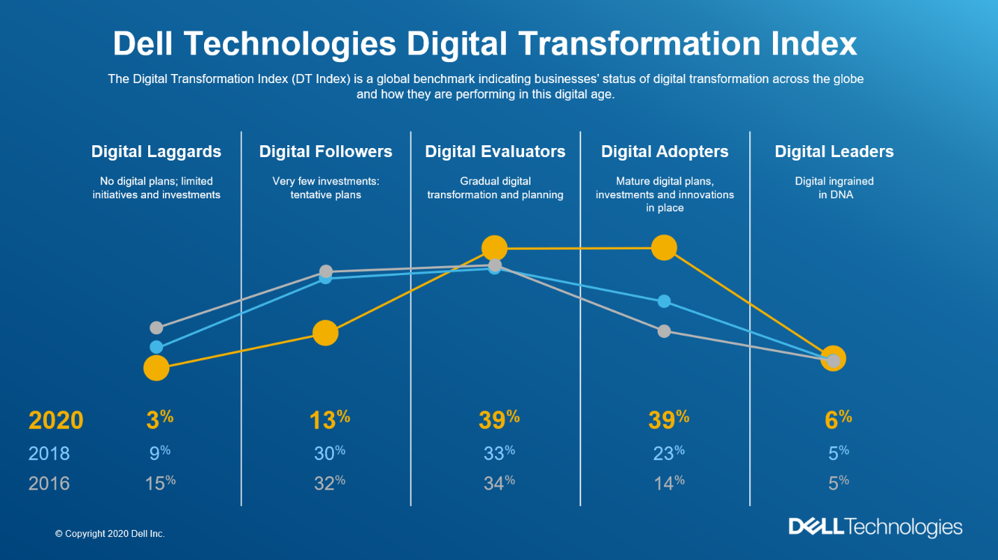 Tijekom srpnja i kolovoza 2020. godine, tvrtka Dell Technologies u partnerstvu s neovisnom istraživačkom agencijom Vanson Bourne anketirala je 4 300 visoko pozicioniranih zaposlenika u 18 zemalja u tvrtkama srednjim do međunarodne veličine. Time se stvorio kvalitetan globalni prikaz razine digitalnog poslovanja s obzirom na IT strategije, prilagodbu i edukaciju zaposlenika te rezultata samog procesa digitalizacije u tvrtkama. Ovo istraživanje predstavlja treće po redu rezultate DT Indexa nakon 2016. i 2018., koje se provodi svake dvije godine.