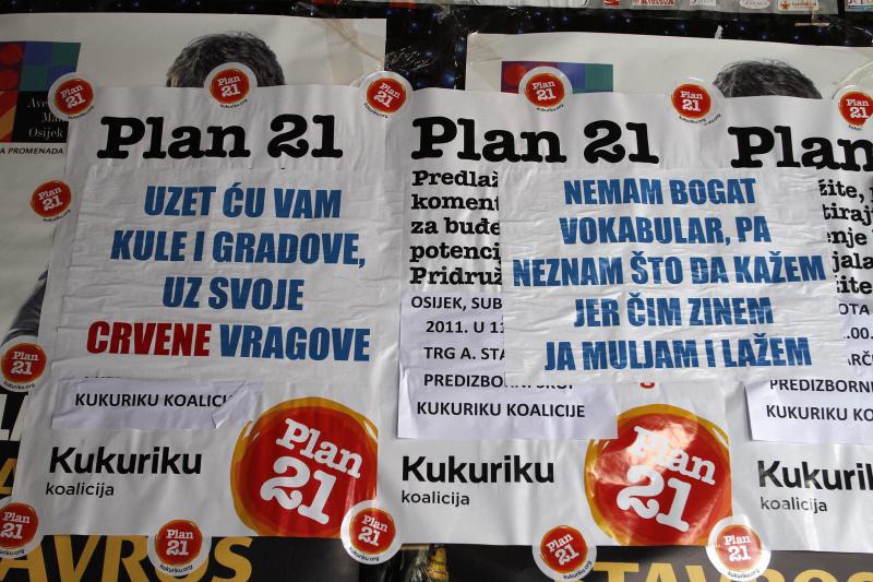 Plakati s izbornim porukama Kukuriku koalicije u Osijeku i njihovim Planom 21 u središtu Osijeka su napadnuti porukama podrugljivog sadržaja.
