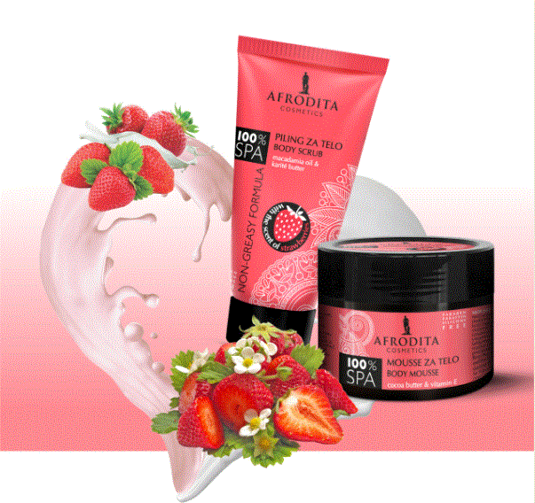 Mousse sa svojom pahuljastom teksturom koži pruža dubinsko vlaženje, a piling sa prirodnim abrazivima koštica nježno odstranjuje odumrle stanice epidermisa. Jednostavnu su najslađi par za njegu svih vrsta kože, pa i masne, jer ne ostavljaju neugodni masni trag. Svojim slatkim mirisom odvest će vas u mirisne vrtove jagoda i izvrstan su izbor za sve koji želite svoju kožu njegovati te ju zaštititi od štetnih utjecaja okoliša. Afroditin savjet: ako još ne znate kako bi je razveselili za Valentinovo, majčin dan ili Dan žena, NOVI proizvodi sa mirisom jagoda više su nego odličan odabir!