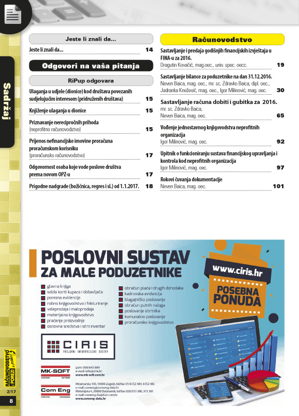 Mjesečnik Računovodstvo i porezi u praksi izlazi petnaest godina i vjerujemo da smo opravdali povjerenje pretplatnika što i dokazuje velik broj čitatelja ovog praktičnog mjesečnika za računovođe, knjigovođe, revizore, porezne savjetnike i financijske djelatnike. Stoga vas pozivamo da se pretplatite na časopis čime dobivate pravo na besplatan pristup call centru, gdje tim eksperata svakodnevno odgovara na vaša pitanja iz područja računovodstva, poreza, plaća i naknada, radnih odnosa, trgovačkog prava.