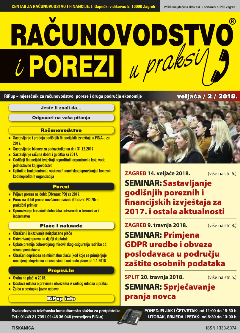 NOVI BROJ ČASOPISA "RAČUNOVODSTVO I POREZI U PRAKSI" 2/2018