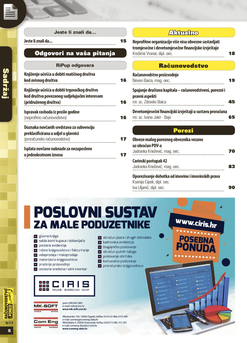 Mjesečnik Računovodstvo i porezi u praksi izlazi petnaest godina i vjerujemo da smo opravdali povjerenje pretplatnika što i dokazuje velik broj čitatelja ovog praktičnog mjesečnika za računovođe, knjigovođe, revizore, porezne savjetnike i financijske djelatnike. Stoga vas pozivamo da se pretplatite na časopis čime dobivate pravo na besplatan pristup telefonskoj konzultantskoj službi, gdje tim eksperata svakodnevno odgovara na vaša pitanja iz područja računovodstva, poreza, plaća i naknada, radnih odnosa, trgovačkog prava.