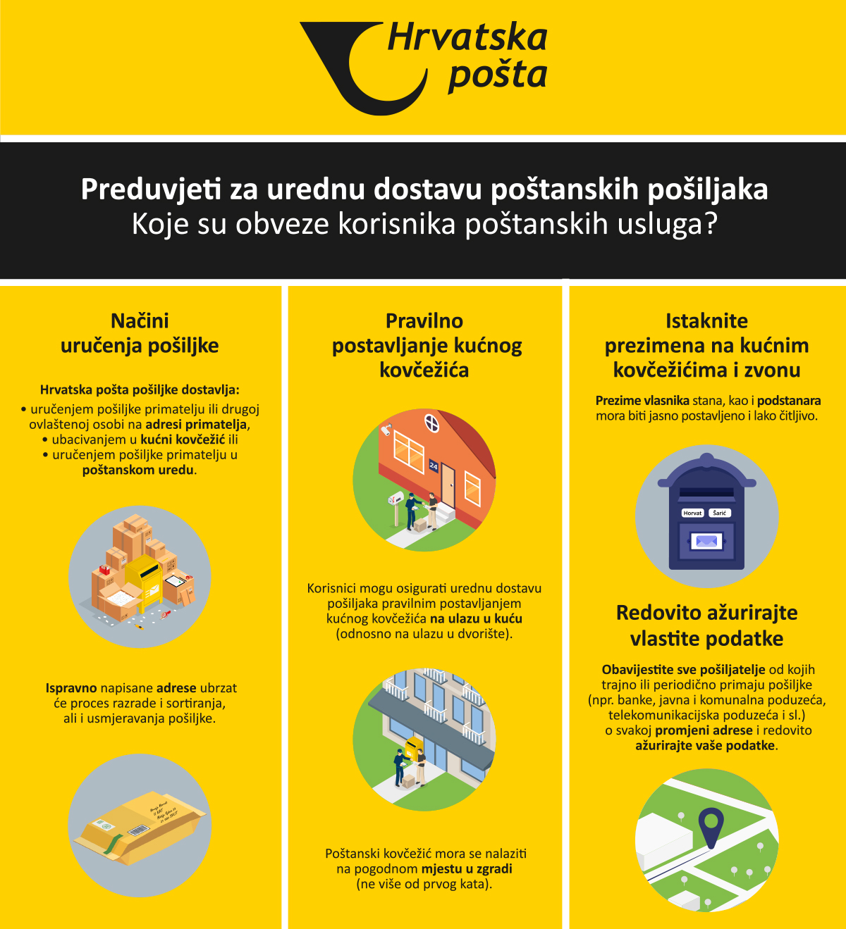 Kako bi dostava pošiljaka mogla biti obavljena uredno i u propisanim rokovima, važno je da i korisnici ispune određene preduvjete. Kao prvo, ispravno napisane adrese na pošiljkama ubrzat će proces razrade i sortiranja, ali i usmjeravanja pošiljke. Kašnjenje zbog nepotpune ili netočne adrese primatelja, sukladno Zakonu o poštanskim uslugama, ne ubraja se u rok uručenja.