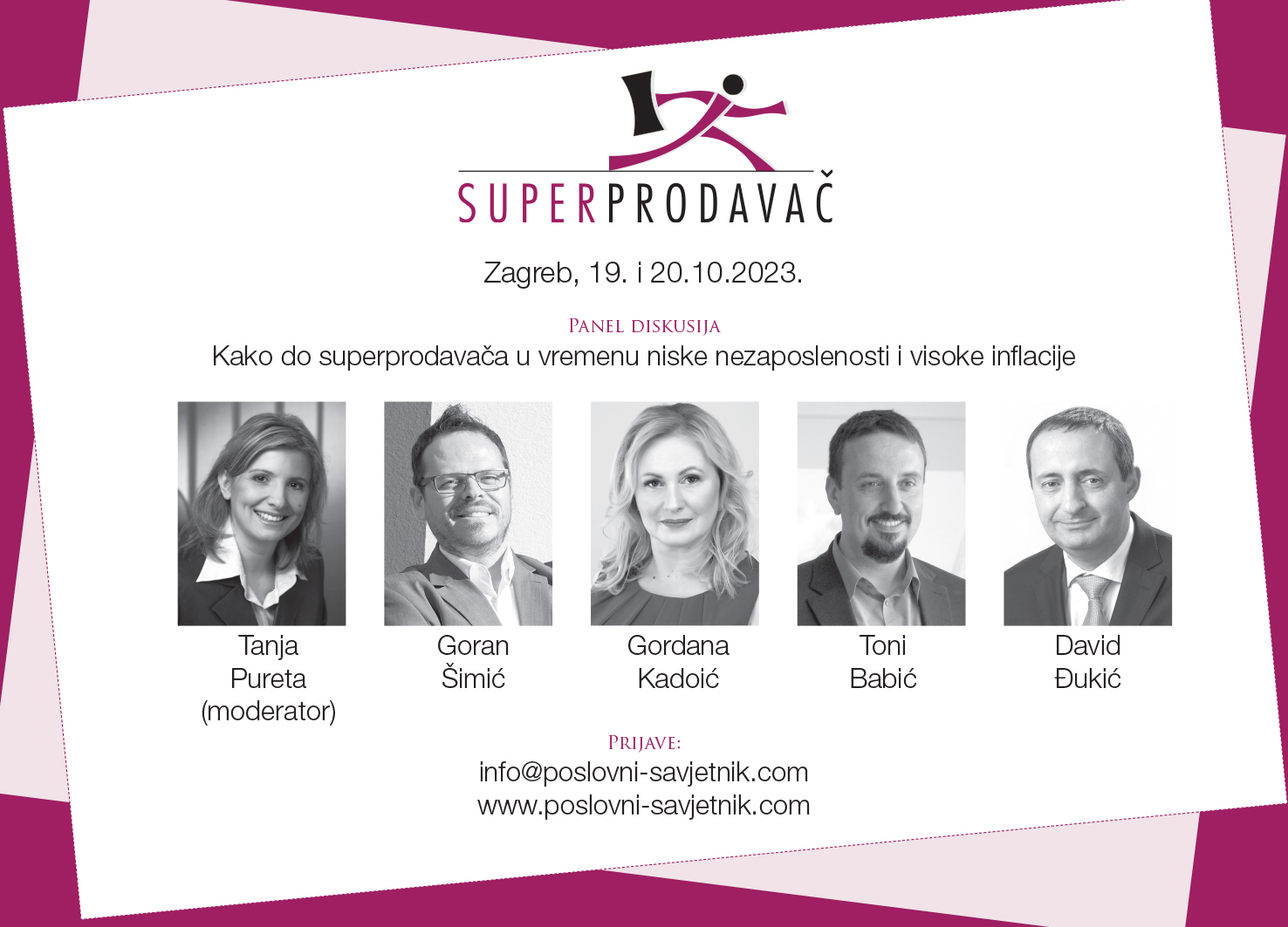 Panel rasprava: Kako do superprodavača u vremenu niske nezaposlenosti i visoke inflacije-panelisti su Tanja Pureta, Gordana Kadoić, David Đukić, Toni Babić, Goran Šimić...Trenutno vrijeme u kojem živimo i radimo stavlja pred prodaju brojne izazove. S jedne strane inflacija smanjuje kupovnu moć, što znači da kupci puno pažljivije i opreznije pristupaju procesu kupnje. S druge strane, to zahtijeva uistinu vične prodavače, superprodavače, koji razumiju i vole prodaju, vjeruju u proizvode i usluge koje nude te poštuju kupce. Doći do takvih superprodavača u vrijeme kada na tržištu nema dovoljno kvalitetnih radnika ni u kojoj struci i industriji, uistinu je zahtjevan izazov. Zato smo na ovaj panel pozvali vrsne stručnjake koji svakodnevno žive prodaju, ne kako bismo zajedno kukali nad izazovima, već kako bi s vama podijelili mogućnosti koje vam stoje na raspolaganju te vas inspirirali da primijenite neke od njih ili sami pronađete neke svoje.