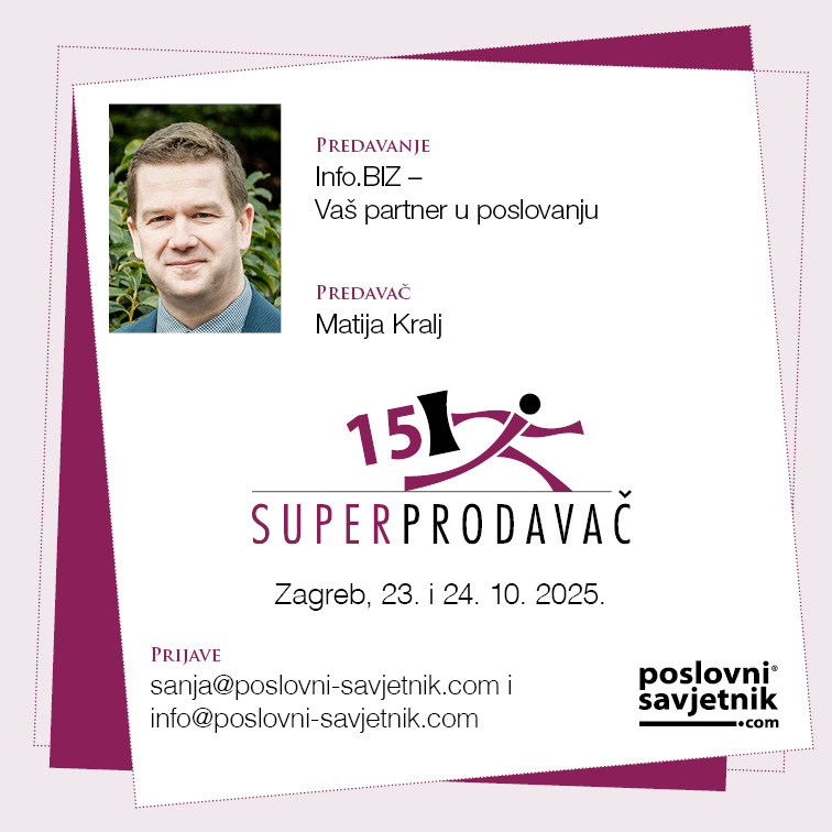 U zagrebačkom kongresnom centru Antunović, 23. i 24.10.2025. održat će se JUBILARNA petnaesta po redu prodajna konferencija Superprodavač, te će se dodijeliti godišnje nagrade B2B Superprodavač godine. Organizator je portal Poslovni savjetnik, konferencija će okupiti oko 150 sudionika.
