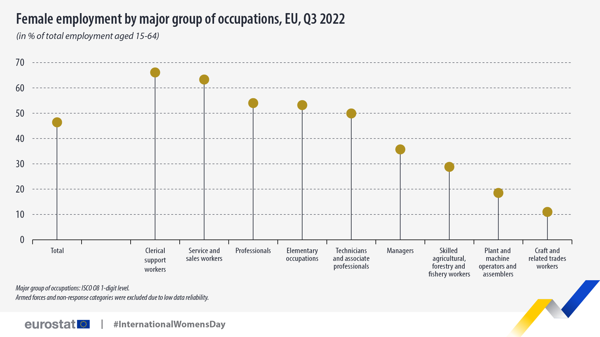 U trećem tromjesečju 2022. u EU većina zaposlenih osoba u dobi od 15 do 64 godine bili su muškarci (54% muškaraca u usporedbi s 46% žena). Međutim, što se tiče zanimanja (prema ISCO-u), bilo je više ženskih pomoćnih službenica (66% od ukupno zaposlenih osoba u dobi od 15-64 u ovom zanimanju), uslužnih i prodajnih radnica (63%), stručnih žena npr. znanstvenici, učitelji (54%) i žene u osnovnim zanimanjima (53%). Na drugom kraju ljestvice, žene su činile manje od petine ljudi zaposlenih kao radnice u obrtu i srodnim obrtima (11%) te rukovateljice postrojenjima i strojevima te monterice (19%).