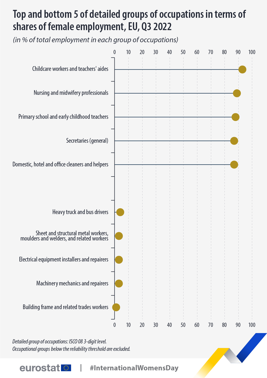 Na detaljnijoj razini, žene u EU-u činile su veliku većinu zaposlenih osoba među djelatnicima koji skrbe o djeci i pomoćnim učiteljima (93% od ukupno zaposlenih u ovom zanimanju u trećem tromjesečju 2022.), medicinskim sestrama i primaljama (89%) i primarnim učitelji u školi i ranom djetinjstvu (88%).
