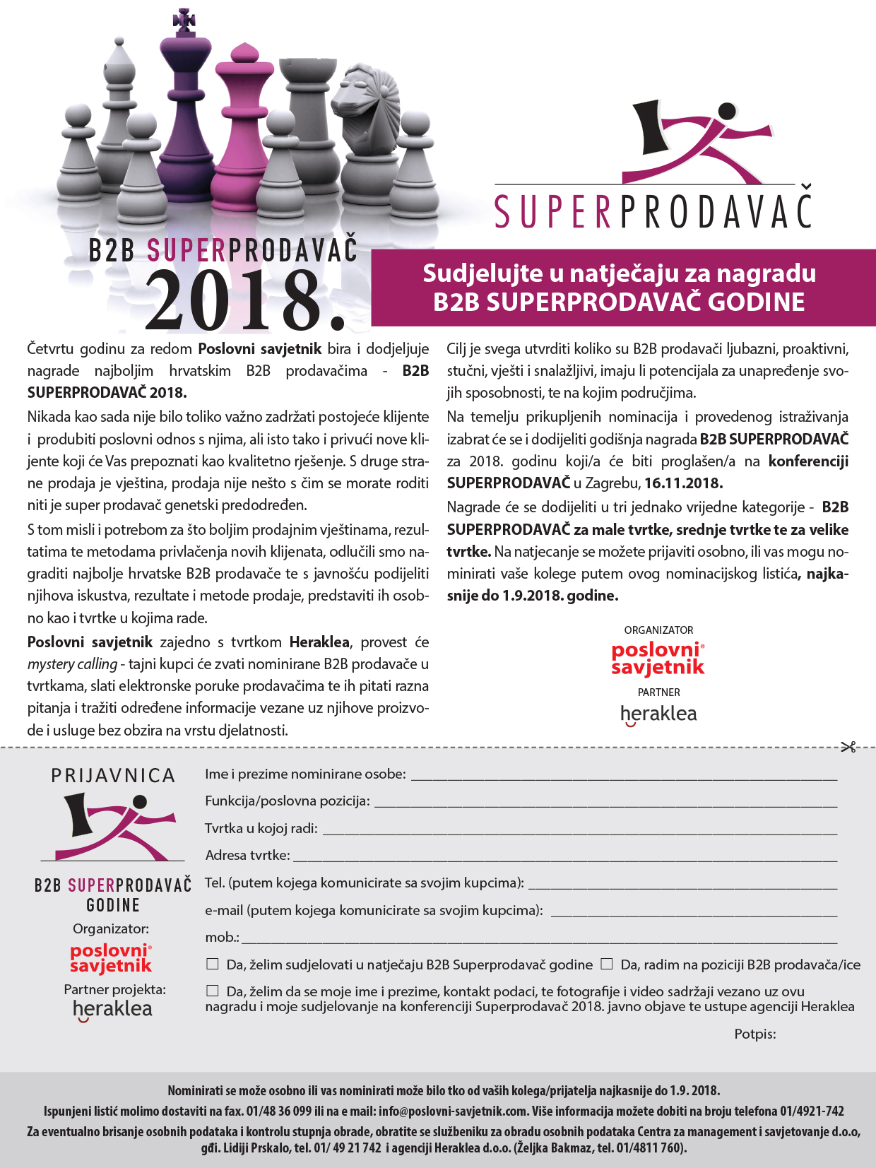 Sudjelujte u natječaju za nagradu B2B Superprodavač godine koja će se u tri jednako vrijedne kategorije dodijeliti 16.11.2018. u sklopu tradicionalne dvodnevne konferencije Superprodavač 2018.