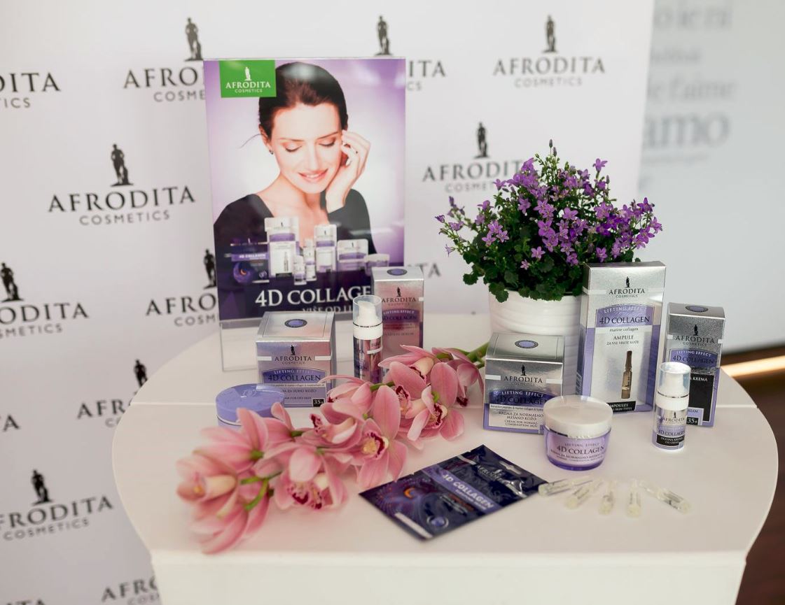 Linija 4D COLLAGEN sastoji se od širokog spektra proizvoda koji zadovoljavaju sve potrebe kože u tridesetim godinama i uključuje Hidratantni serum za intenzivni osjećaj hidratacije, Kreme za normalnu-mješovitu kožu i za suhu kožu, Kremu oko očiju, Sleeping masku za bogatu njegu dok spavate i Ampule za 7-dnevno maksi pomlađivanje. Veliki broj pozvanih predstavnika medija, blogerica i posebnih gostiju je nakon »talk showa« druženje nastavilo u prekrasnom ambijentu vidikovca Zagreb Eye, gdje su u Afroditinom kutku ljepote isprobali sve predstavljene proizvode linije 4D COLLAGEN, a stručnjaci Kozmetike Afrodita su sa veseljem podijelili savjete o ispravnoj i kvalitetnoj njezi kože.