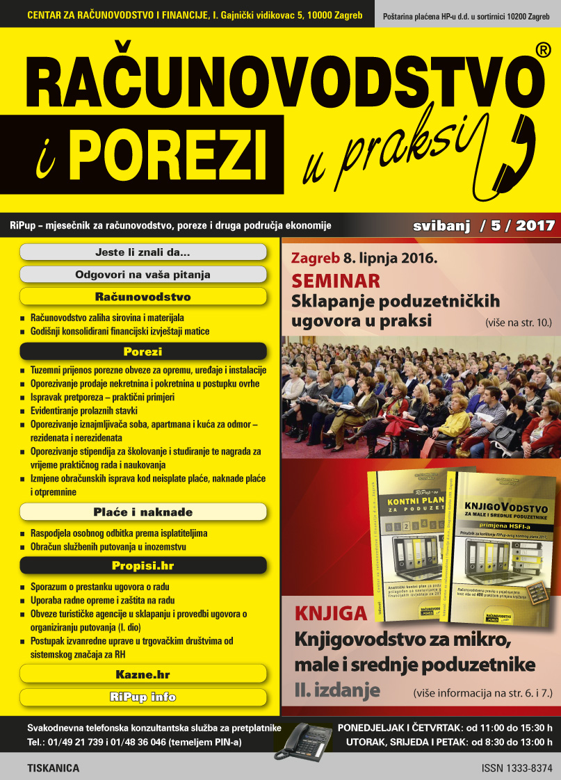 Mjesečnik Računovodstvo i porezi u praksi izlazi petnaest godina i vjerujemo da smo opravdali povjerenje pretplatnika što i dokazuje velik broj čitatelja ovog praktičnog mjesečnika za računovođe, knjigovođe, revizore, porezne savjetnike i financijske djelatnike. Stoga vas pozivamo da se pretplatite na časopis čime dobivate pravo na besplatan pristup telefonskoj konzultantskoj službi, gdje tim eksperata svakodnevno odgovara na vaša pitanja iz područja računovodstva, poreza, plaća i naknada, radnih odnosa, trgovačkog prava.