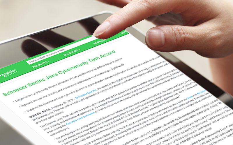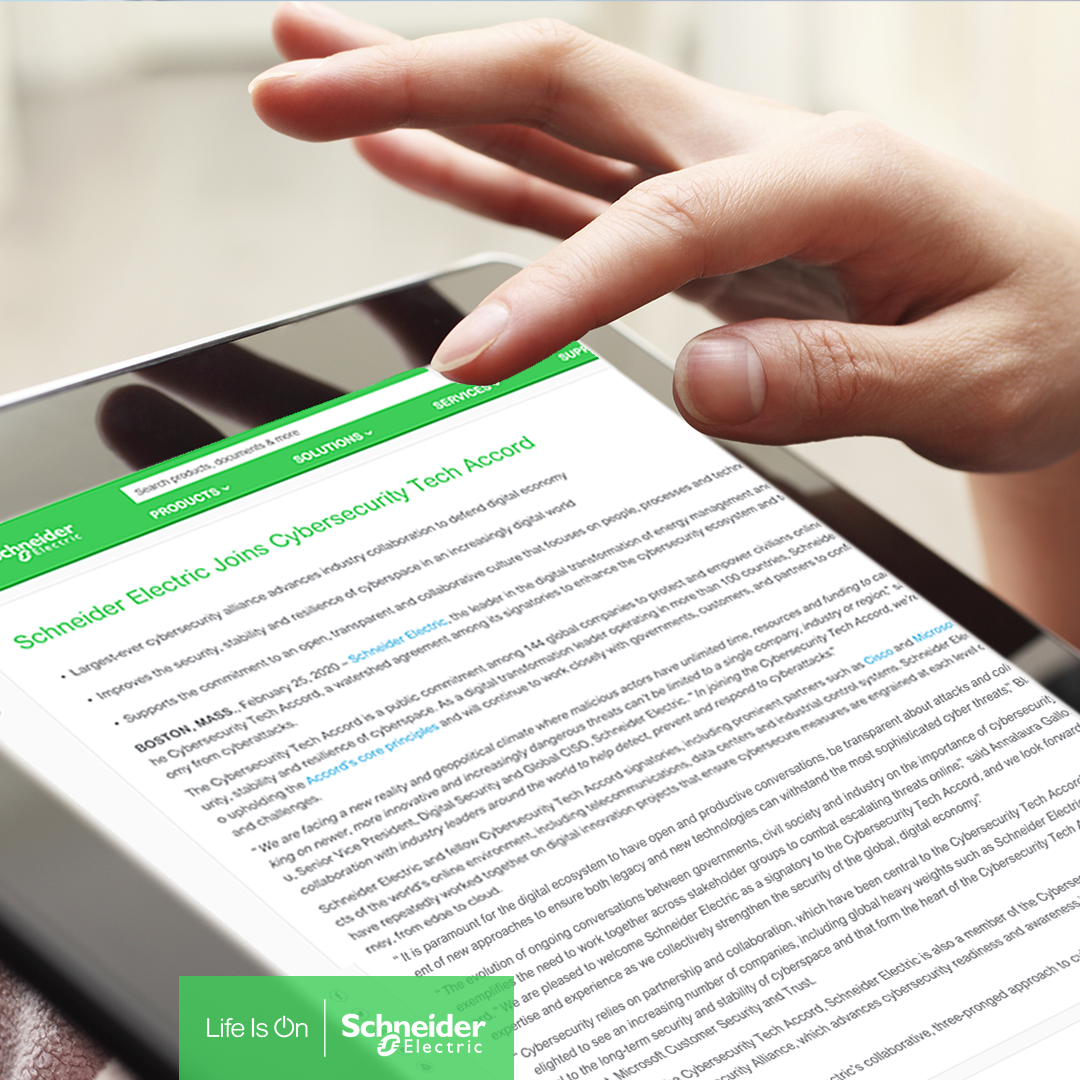 Schneider Electric predvodnik u digitalnoj transformaciji upravljanja energijom i automatizaciji, pridružio se Tehničkom sporazumu o kibernetičkoj sigurnosti, revolucionarnom dogovoru država potpisnica da će raditi na poboljšavanju ekosustava kibernetičke sigurnosti i braniti digitalnu ekonomiju od kibernetičkih napada.