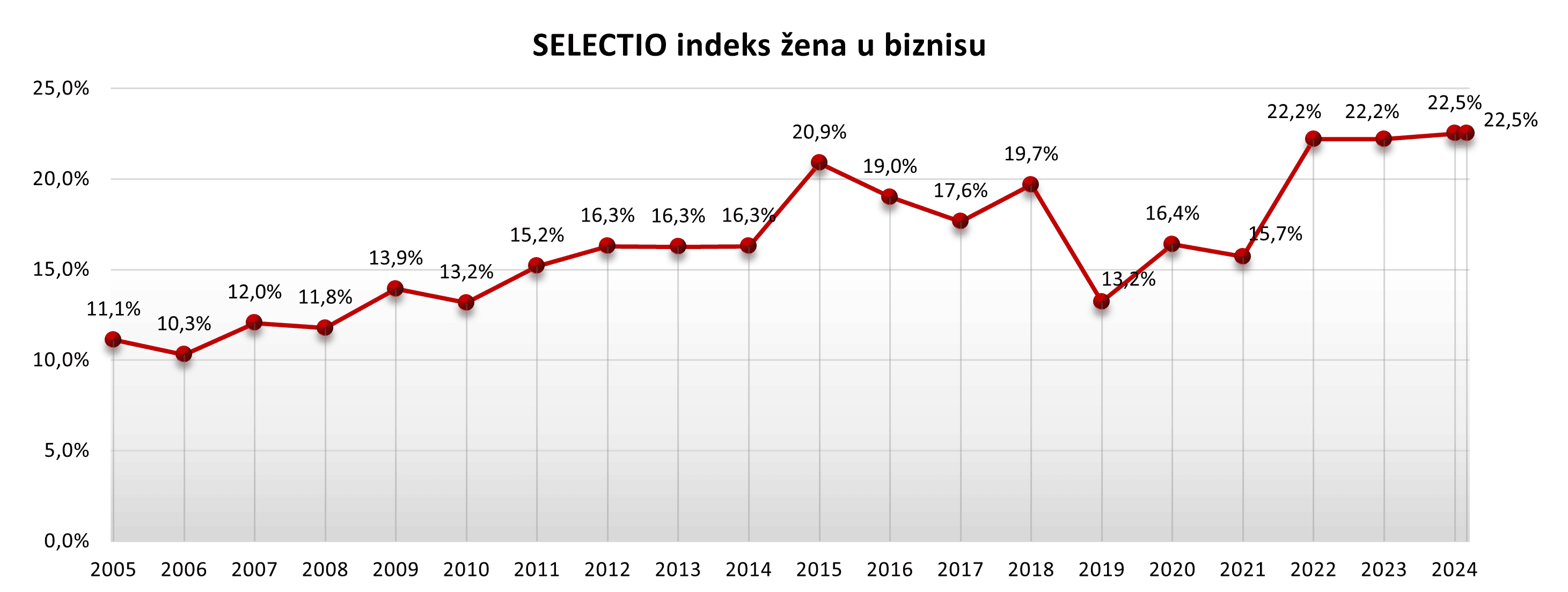 SELECTIO Indeks žena već 20 godina mjeri udio žena u upravama društava u sastavu indeksa CROBEX, a u 2025. godini iznosi 22,5% te bilježi blagi rast u odnosu na 19,4% iz istog razdoblja 2024. godine.