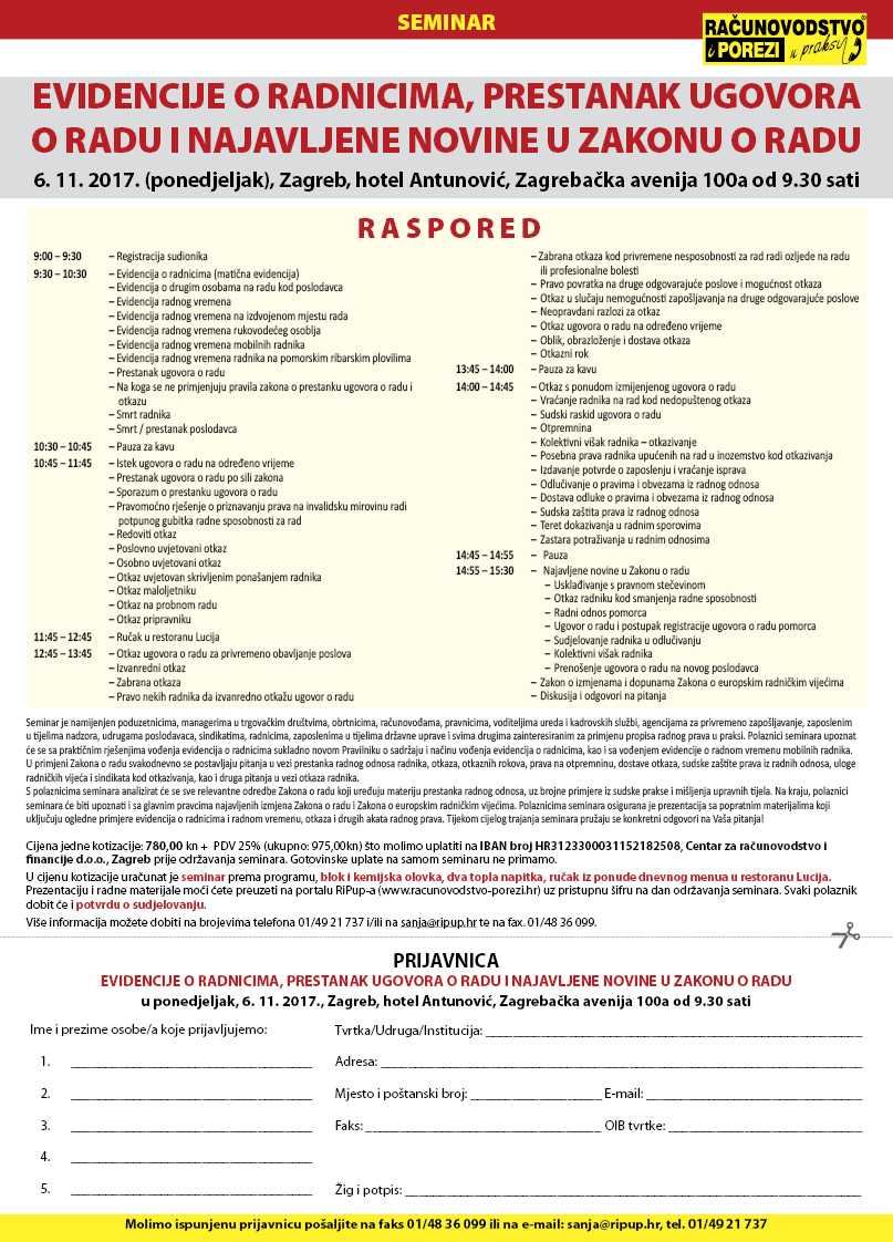 Seminar je namijenjen poduzetnicima, managerima u trgovačkim društvima, obrtnicima, računovođama, pravnicima, voditeljima ureda i kadrovskih službi, agencijama za privremeno zapošljavanje, zaposlenim u tijelima nadzora, udrugama poslodavaca, sindikatima, radnicima, zaposlenima u tijelima državne uprave i svima drugima zainteresiranim za primjenu propisa radnog prava u praksi. Polaznici seminara upoznat će se sa praktičnim rješenjima vođenja evidencija o radnicima sukladno novom Pravilniku o sadržaju i načinu vođenja evidencija o radnicima, kao i sa vođenjem evidencije o radnom vremenu mobilnih radnika. U primjeni Zakona o radu svakodnevno se postavljaju pitanja u vezi prestanka radnog odnosa radnika, otkaza, otkaznih rokova, prava na otpremninu, dostave otkaza, sudske zaštite prava iz radnih odnosa, uloge radničkih vijeća i sindikata kod otkazivanja, kao i druga pitanja u vezi otkaza radnika.
