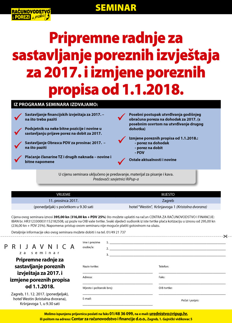 U organizaciji  časopisa Računovodstvo i porezi u praksi (RiPup), 11.12.2017. (ponedjeljak) u zagrebačkom hotelu Westin, Kristalna dvorana u 9.30 sati, održat će se jednodnevni seminar s konkretnim primjerima i odgovorima na vaša pitanja "Pripremne radnje za sastavljanje poreznih izvještaja za 2017. i izmjene poreznih propisa od 1.1.2018."