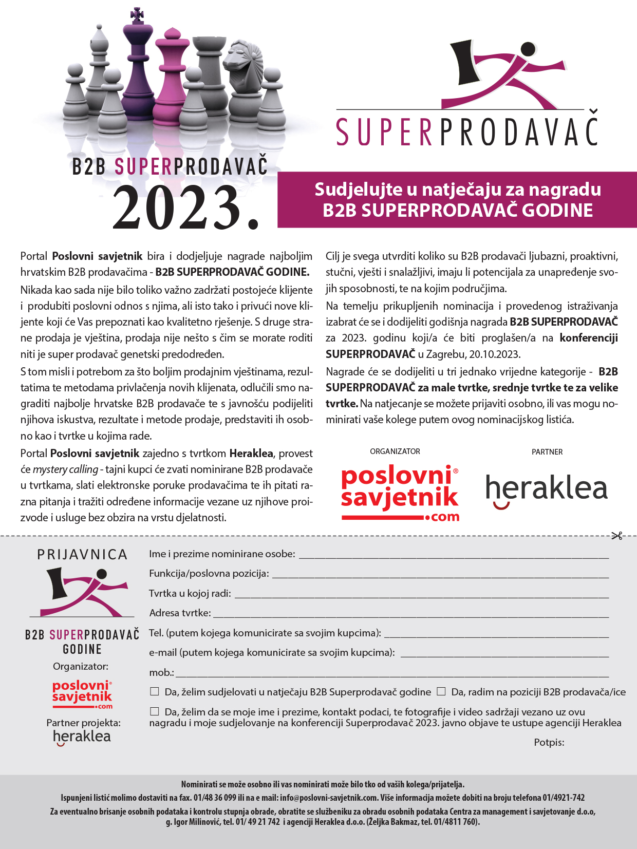Nominirati možete sebe ili kolegu/icu putem nominacijskog listića kojega je potrebno poslati na e-mail info@poslovni-savjetnik.com najkasnije do 1.6.2023.